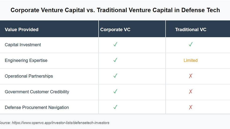 VC activity in defense tech is not limited to Silicon Valley generalists. Corporate venture capital from primes and strategic industrial partners is increasingly active. They offer not just capital but also alliances that help startups navigate complex defense procurement and integration pathways.